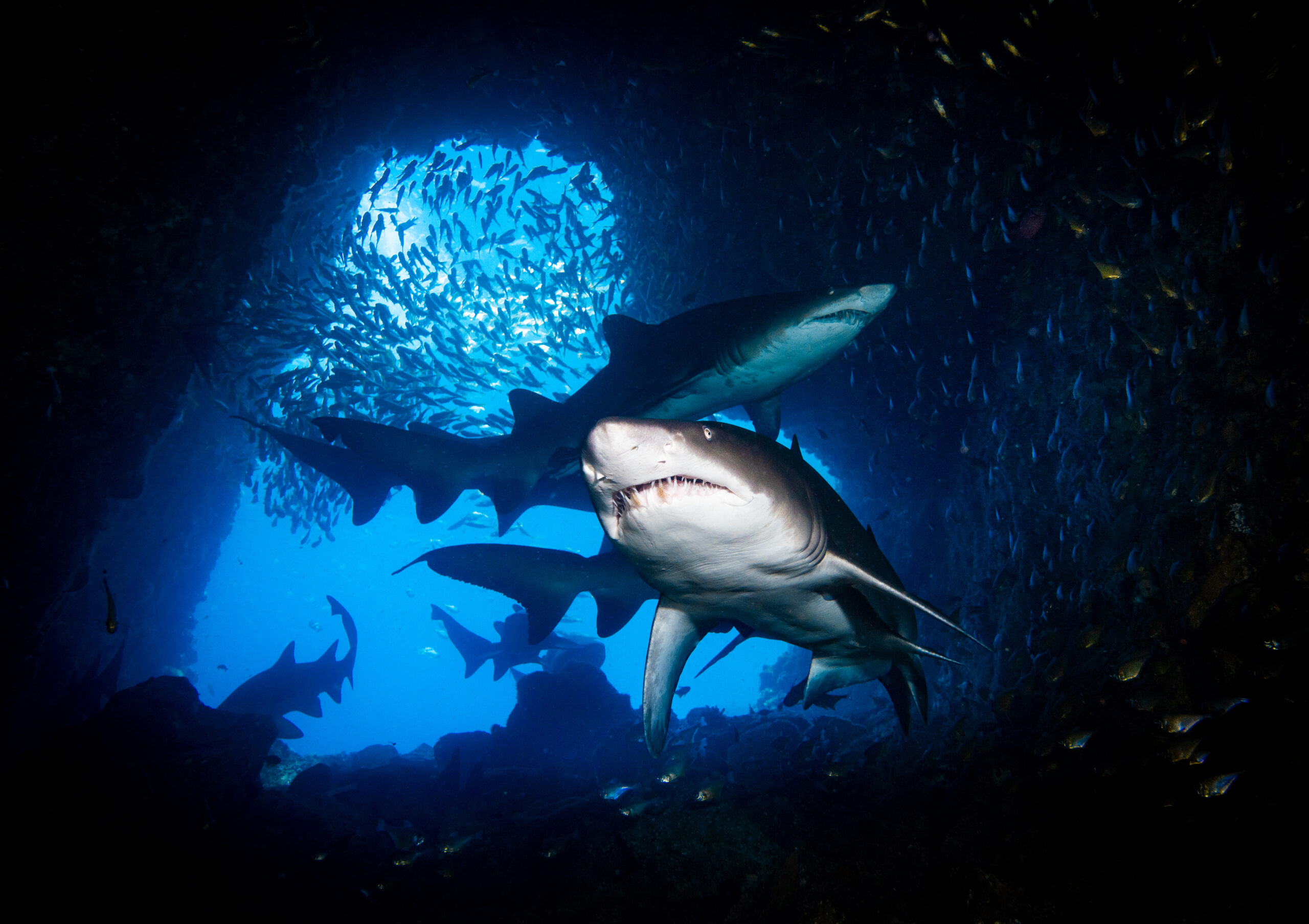 A school of Grey Nurse Sharks sweeps through the cave’s opening, backlit by a halo of baitfish and the ambient blue of the Pacific. This dynamic moment, captured during their peak aggregation season, speaks to the quiet success of protected habitats like Fish Rock Cave.
