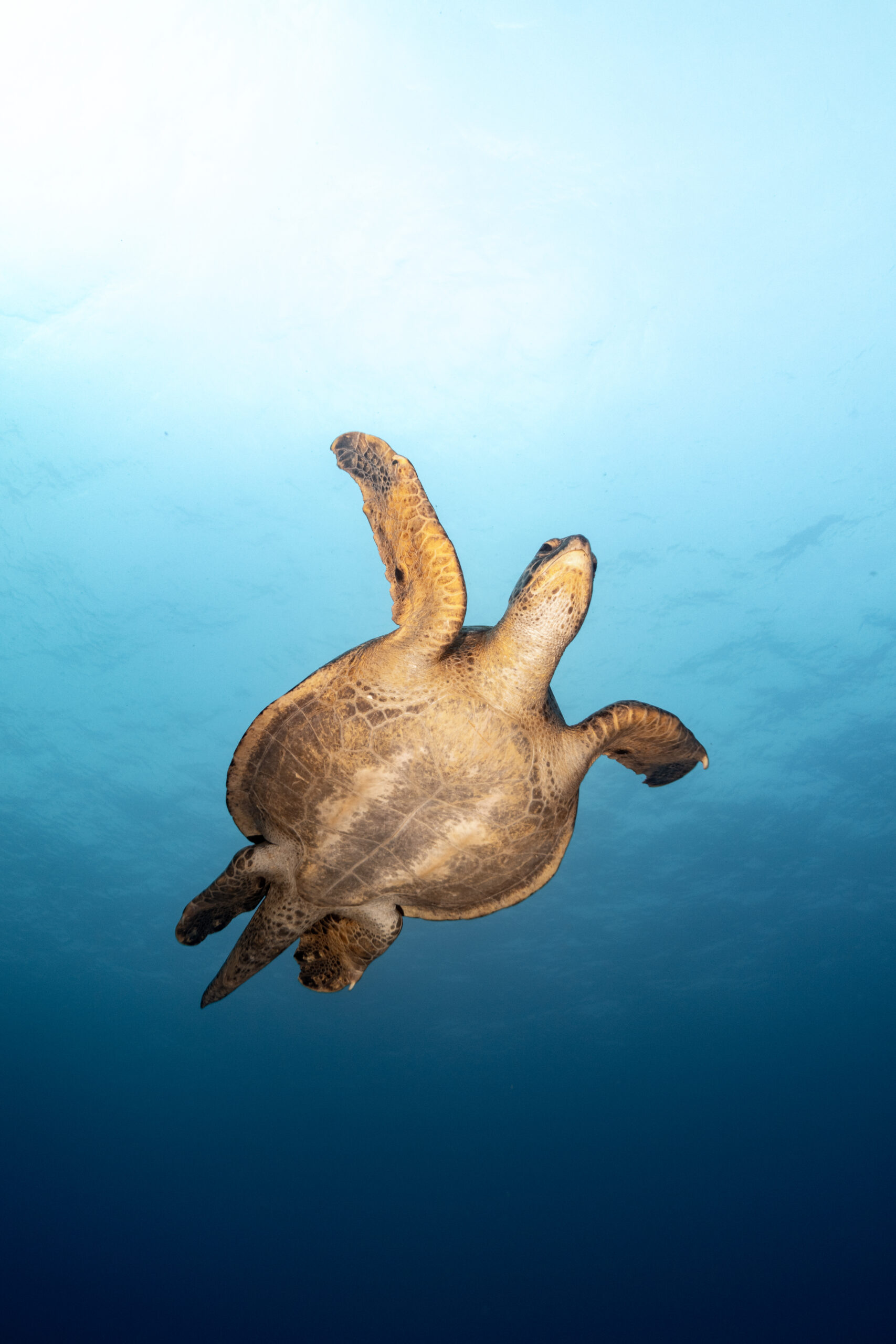 A green turtle swims above head, in the cool, clear waters of Wolf Island, Galápagos.