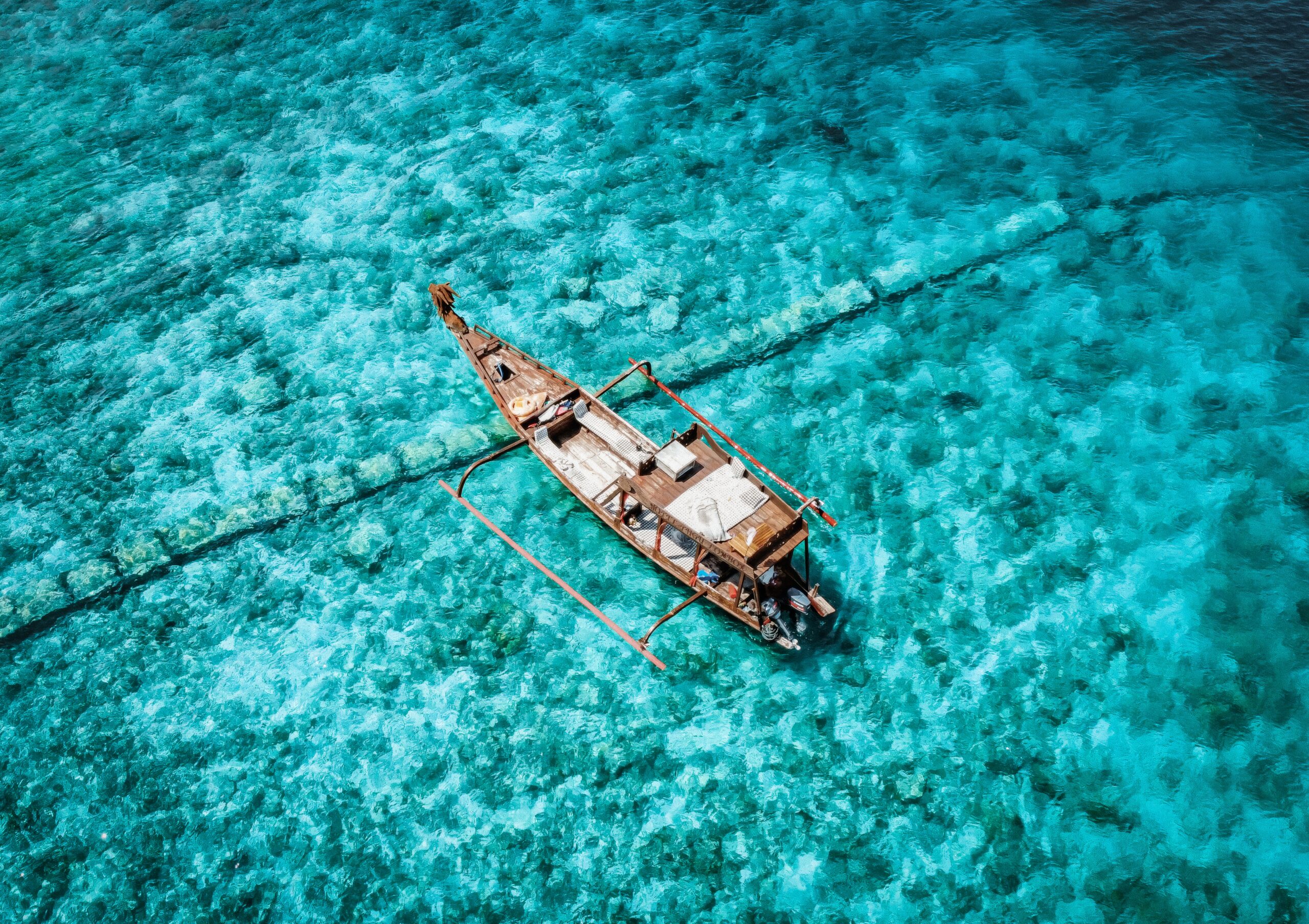 Aerial photograph of a fishing boat on Gili Trawangan, Indonesia